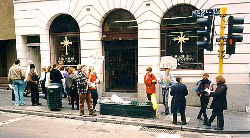 1. Out the front of the org. We got quite a few people along. Signs: 'SCIENTOLOGY SUPPRESSES FREE SPEECH' and 'HANDS OFF THE INTERNET'. The woman in the rightmost red jacket is Judy Tampion (CoS PR).