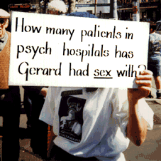 2.. My own personal slander! How ... heartwarming it is. The advertising genii of the CoS will have John Singleton giving up in shame. (This shot also shows the CultAware: Serpent of Fear and Death T-shirts the counter-demonstrators were wearing.)
