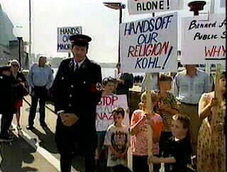 Video stills: front- and side-on shots of the Scientologists with their kids (who they dragged out to increase the numbers - gotta keep them stats up).