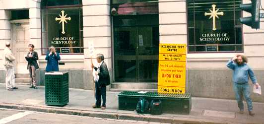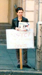 2. CoS staffer holding up a copy of the Australian edition of Freedom. Sign: 'RESPECT THE RELIGIOUS BELIEFS OF OTHERS'.