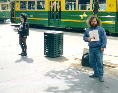 3. Barbara and Frank handing out our surplus leaflets in Swanston Walk after the demo. Frank is holding up a Lisa leaflet inside a Roland's Xemu.