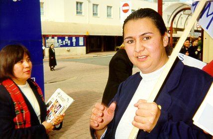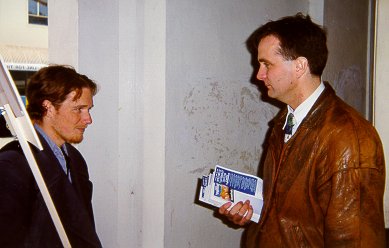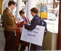 7. Signs for both sides. "The falsely presented smile of the woman to the right (Jeanette Lang, wife of word clearer) is sickening. 'I get paid 5 cents per week to smile like this!'"