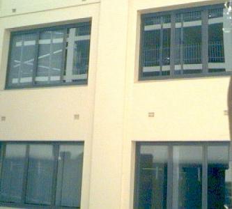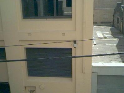 7. "Windows into the upper two floors of the building. I think they're in the middle, but I don't remember. Last time I looked there were some people in one of the rooms so I assume they are courserooms. There appeared to be something like an LED glowing near where the internal door might be so I assume they have some kind of central access mechanism."